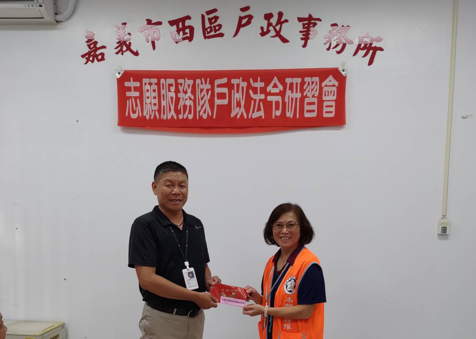 此次研習除充實志工伙伴對戶政法令認知,攸關民眾切身權益的首次護照親辦作業等做詳細說明外,更強化志願服務理念及服務品質,落實志願服務法制,簡要說明志願服務禮儀及工作項目,以達到充分運用志工人力資源,提升為民服務品質,發揮志願服務效能。另主任會中亦特別公開表揚並致贈禮券予績優志願服務得獎志工,恭喜顏玉真女士、陳瀅如女士榮獲本市志願服務銀質獎,鍾蓮花女士榮獲內政業務志願服務獎勵金質獎,黃鳳治女士榮獲全國志願服務獎勵銅牌獎。